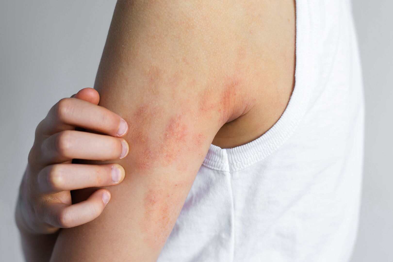 Typische Anzeichen sind gerötete, schuppige oder nässende Hautstellen. Bei Säuglingen zeigen sich Ekzeme häufig im Gesicht und an den Außenseiten von Armen und Beinen, später oft in den Gelenkbeugen, am Hals oder an den Händen.